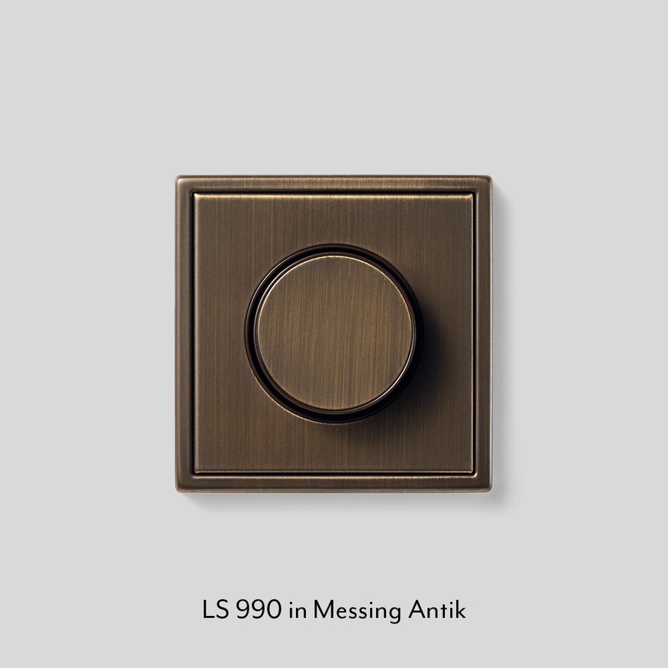 Die neue Gestaltung für Drehdimmer-Abdeckungen wirkt noch harmonischer, die Bedienung ist einfacher. Das flachere Design steht für Drehdimmer, Drehzahlsteller, Potentiometer und Drehregler zur Verfügung. In den Schalterprogrammen aus Echtmetall ist die Vorderseite des Drehknopfs nun aus demselben Material. Darüber hinaus übernehmen die gebürsteten Varianten Messing Antik und Messing Classic ihren speziellen Schliff nun auch für den Drehknopf.